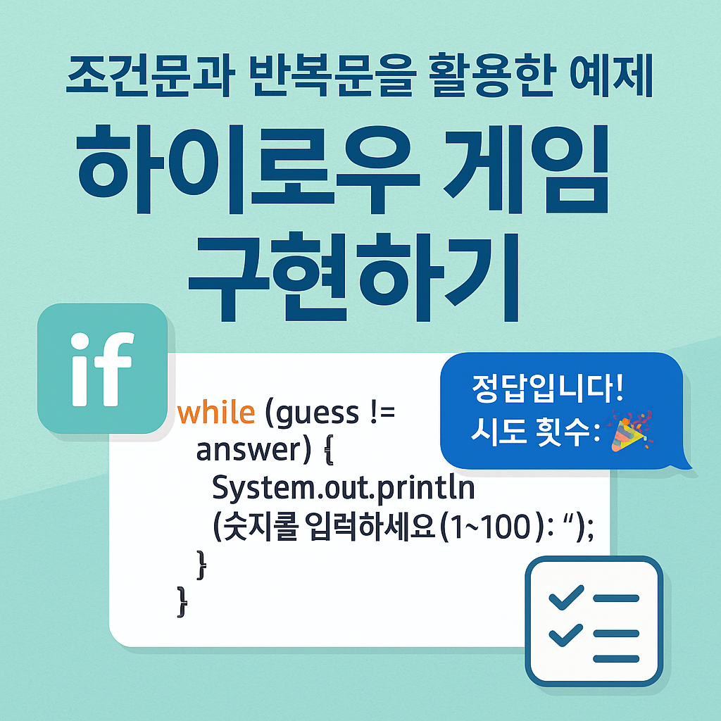 💡 조건문과 반복문만으로도 이렇게 재미있는 게임을 만들 수 있다고요? 간단한 제어문 몇 줄로 실습 가능한 ‘하이로우 게임’ 예제로, 알고리즘 사고력을 기를 수 있습니다!
