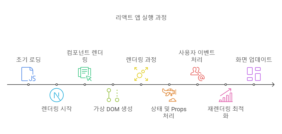 React 앱은 단순한 HTML 문서처럼 보이지만, 사실 정교한 번들링 시스템과 렌더링 흐름을 포함하고 있어요. 앱을 브라우저에서 처음 실행할 때는 다음과 같은 단계가 순차적으로 이뤄집니다.