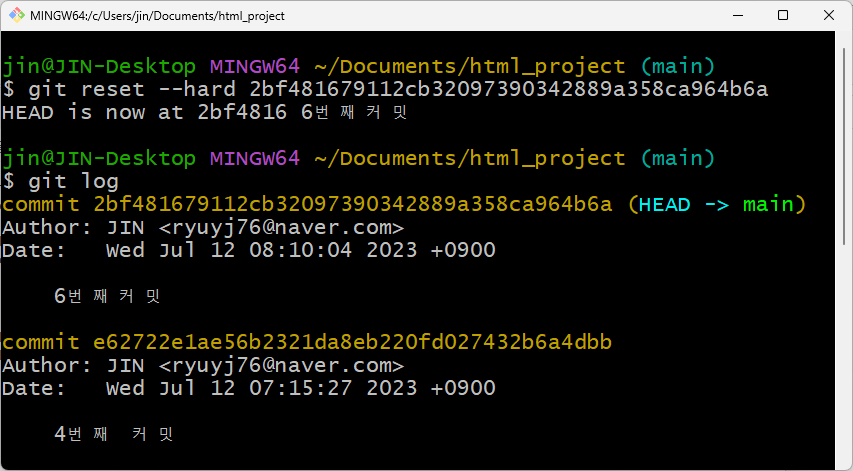- 실수한 작업을 되돌리는 git restore, git reset 명령어를 익힙니다.