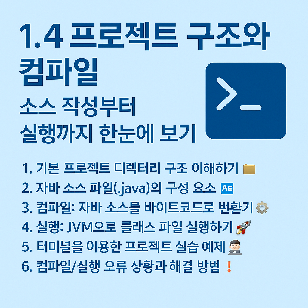 이제 이 구조만 이해해도 기본적인 자바 파일은 직접 작성해볼 수 있어요. 다음 단계에서는, 이 소스 파일을 컴파일해서 실행 가능한 형태로 만드는 과정을 설명해볼게요!