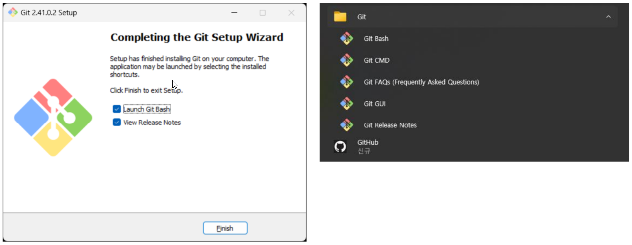 - 설치가 완료되면, "Git Bash" 또는 "Git CMD"를 실행하여 정상적으로 설치되었는지 확인합니다.