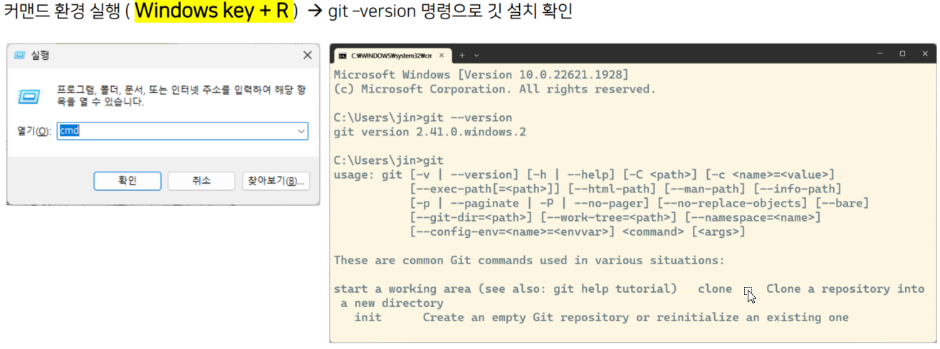- 아래 명령어를 입력하여 Git이 설치되어 있는지 확인합니다.